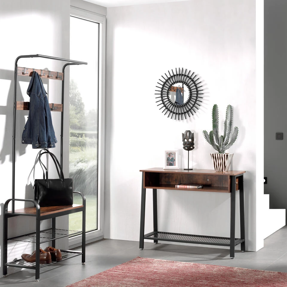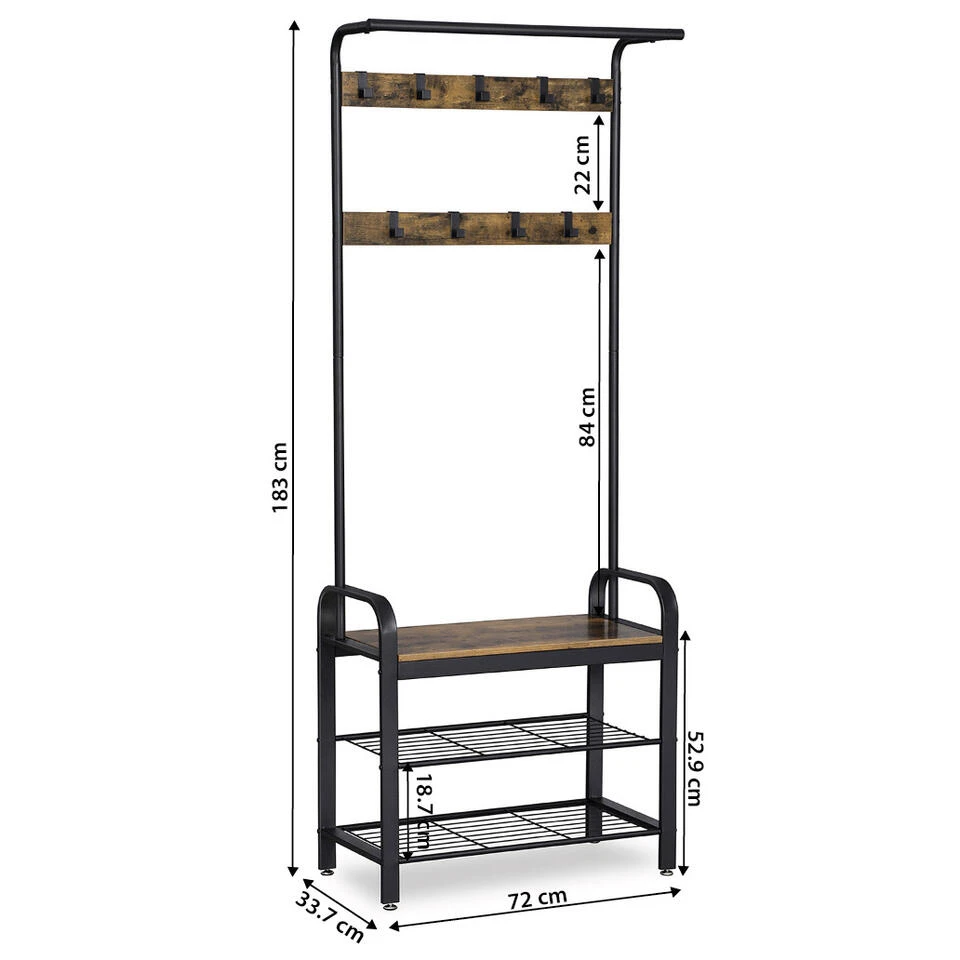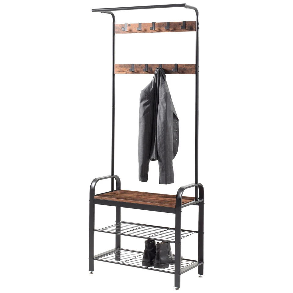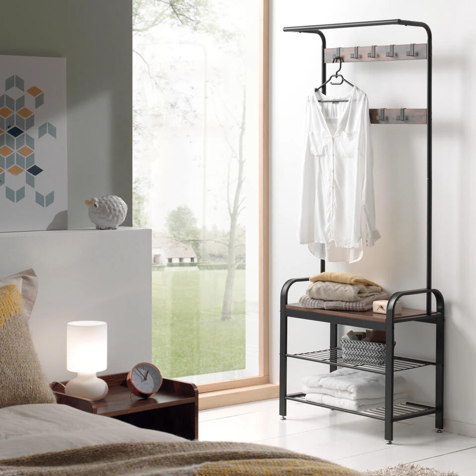 Droomt u ook van een handig en decoratief garderoberek? Zoek niet verder, deze kapstok is helemaal wat u nodig hebt. Aan dit meubel hang je jassen of kleren, kan je schoen in kwijt en krijg je er een handig plankje bovenop om iets op te leggen of om zelf op plaats te nemen.