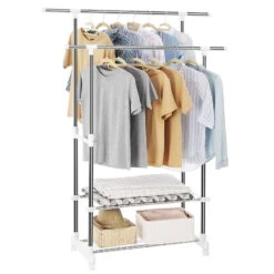 De echte modebewuste vrouw of man heeft aan de traditionele kledingkast vaak niet genoeg. Deze barst als het ware van de kledingstukken, met als extra nadeel het verlies aan overzicht. Kies daarom voor dit dubbel kledingrek waar plaats is voor allerlei outfits, inclusief schoenen!