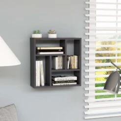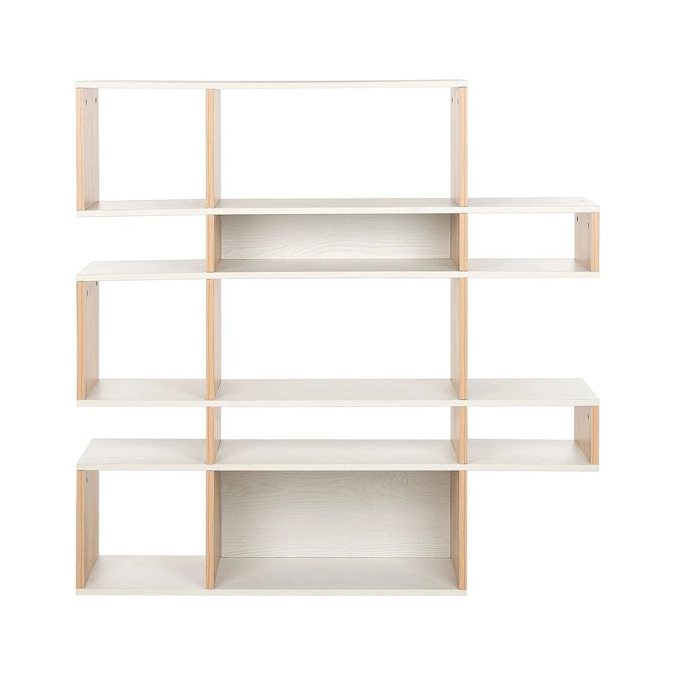 Open boekenkast. Met deze moderne boekenkast vind je eindelijk ruimte voor al je spulletjes. Met vijf niveaus van open planken biedt het voldoende ruimte voor boeken, decoratieve items, en meer. Als je gesloten opbergruimte nodig hebt, kun je het gemakkelijk combineren met manden. Het asymmetrische frame en de verschillende groottes van de planken geven het een karakter en een stijlvolle uitstraling, die elke moderne inrichting zal verbeteren.