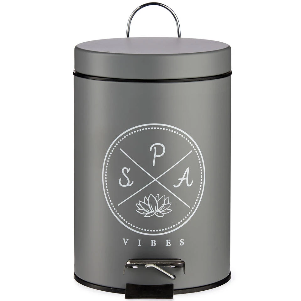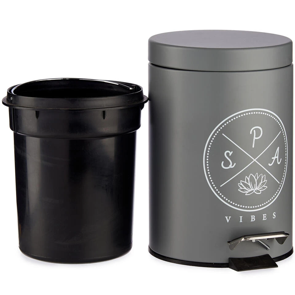 Vuilnisbak/pedaalemmer donker grijs met tekst 3 liter van 17 x 25 cm. Een donkergrijze vuilnisbak/vuilnisemmer/pedaalemmer/prullenbak, met voetpedaal opening/sluiting. De vuilnisbak heeft een metalen handvat voor makkelijk verplaatsen en een kunststof verwijderbare binnen emmer met handvat. Afmeting: ca. D17 x H25 cm, diepte incl. pedaal ca. 22,5 cm. Materiaal: aluminium/kunststof.