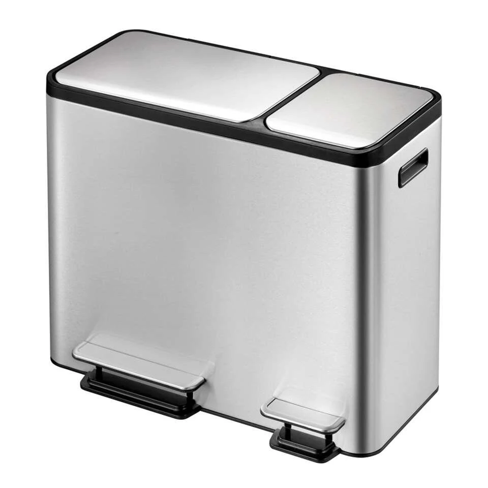 EKO EcoCasa rechthoekige recycling pedaalemmer 30+15 liter van mat RVS heeft fingerprint proof coating en twee kunststof binnenemmers voor afvalscheiding. Deze prullenbak heeft een gedempt sluitend deksel met stay open functie, voor het makkelijk schoonmaken van de afvalbak of wisselen van de afvalzak. Voorzien van handgrepen aan de zijkant.