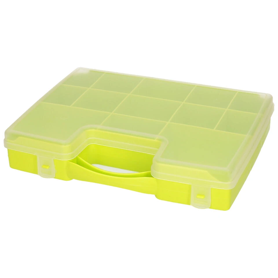 1x Opbergkoffertje/opbergdoos 13-vaks. Deze handige opbergkoffer/opbergbox met een deksel en kliksluiting heeft 13 vakjes van diverse afmetingen. Ideaal om bijvoorbeeld uw naai- of klusspulletjes, diamond painting, kralen en ander klein spul in op te bergen. Afmeting: ca. 27,5 x 20,5 x 3 cm. Materiaal: kunststof. Naaigerei sorteerdoos/opberger.