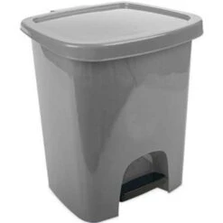 Grijze pedaalemmer vuilnisbak/prullenbak 6 liter 21 x 23 x 29 cm. Vierkante/rechthoekige vuilnisemmer. De grijze bak is te gebruiken als prullenmand of om afval mee te scheiden. Dankzij het zelfsluitende deksel (pedaalemmer) worden de meeste geurtjes tegengehouden, waardoor de bak ook geschikt is om te gebruiken voor het scheiden van GFT afval, maar ook voor het weggooien dameshygiene producten op het damestoilet.