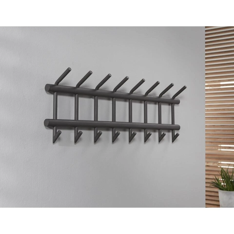 Wij zijn continue bezig met het samenstellen van stoere collecties die naast functioneel ook nog is heel trendy zijn. Veel van ons assortiment is zo ontworpen dat het leuk bij elkaar staat in elke kamer, daarom raden wij zeker aan om even een kijkje te nemen in ons assortiment voor leuke matchende items!Deze kapstok heeft een ronde buis, uitgevoerd in donkergrijs mat gepoedercoat staal. In totaal heeft dit model 8 gelaste haakjes, die zowel aan de bovenkant als aan de onderkant een ophangmogelijkheid hebben. De stoere kapstok wordt opgebouwd geleverd. Vervolgens is hij middels 2 bevestigingsogen eenvoudig aan de wand te monteren.