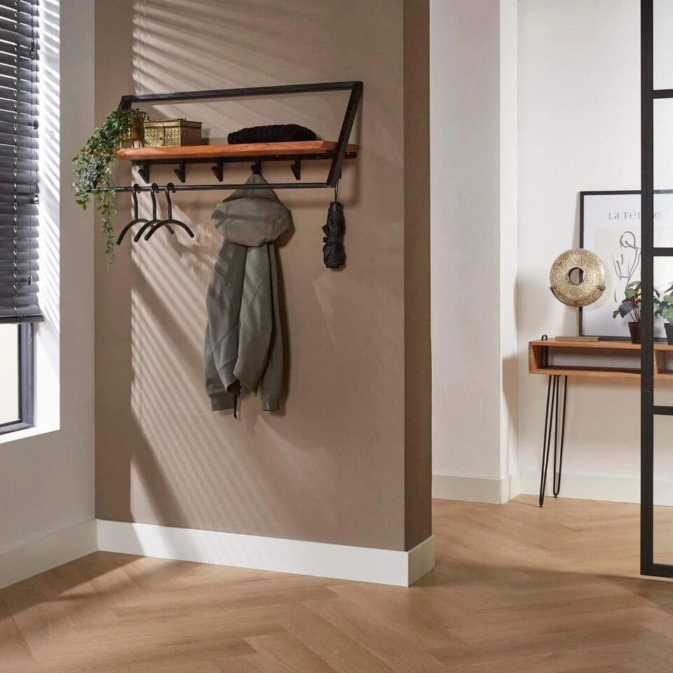 Geniet van het stoere en natuurlijke karakter van Leona kapstok. Deze unieke kapstok komt uit de collectie van het woonmerk Fraaai. De plank is voorzien van een stevig metalen frame met een zwarte poedercoating als afwerking. Opvallend aan dit frame is de ruwe en oneffen look voor een stoere touch. Het frame kan gemakkelijk bevestigd worden aan de muur. Het bevestigingsmateriaal wordt niet meegeleverd omdat iedere muur vraagt om ander materiaal. De kapstok is voorzien van zes stevige haken om de jassen aan op te hangen. Daarnaast is de legplank van acaciahout ideaal voor het opbergen van mutsen, sjaals en handschoenen. Het hout heeft prachtige kleurschakeringen. Plaats kapstok Leona in de hal in huis of op kantoor en combineer hem ook met ander items uit de Leona-serie voor één geheel in het interieur.