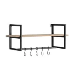 Moderne wandkapstok: deze handige kapstok is een echte must-have voor jouw woonkamer, gang of slaapkamer! Deze kapstok biedt namelijk ruimte voor al jouw jassen, tassen, hoeden en andere accessoires. Enorm handig als je ruimte nodig hebt om je spullen op te bergen. Zwarte muurkapstok voor woonkamer, slaapkamer, gang: deze kapstok is voorzien van 5 handige haken en een praktische plank. Je kunt naast je jassen, vesten en tassen ook je hoeden, sjaals en andere accessoires kwijt. Deze industriële kapstok is verkrijgbaar in 2 verschillende varianten, namelijk: volledig zwart of zwart met hout. Hangende kapstok van hout en metaal: deze wandkapstok heeft een simpel design en is zwart van kleur. Hierdoor past deze muurkapstok in verschillende woonstijlen. Het rek komt goed tot zijn recht in een modern, industrieel of landelijk ontworpen kamer! De kapstok is gemaakt van stevig metaal en hout. Multifunctionele wandkapstok: deze kapstok kan naast kapstok ook dienen als handig kruidenrekje. Gebruik de haakjes voor je short, keukengerei en overhandschoenen en vul de plank met al je kruidenpotjes. Al met al enorm veelzijdig! Jassenkapstok met haken details: materiaal: MDF en metaal; afmetingen: 28 x 70 x 29 cm; 5 kapstokhaken.