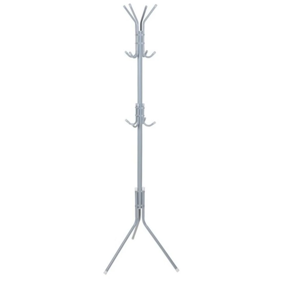 Een grijze staande 3-poots kapstok, met een totale hoogte van ca. 172 cm. Aan de bovenkant is ruimte voor 8 jassen en in het midden kunnen bijvoorbeeld 4 kinderjassen of tassen hangen. Met anti-slip nopjes, zodat de kapstok niet verplaatst en de vloer beschadigd. Materiaal: Metaal met kunststof nopjes.