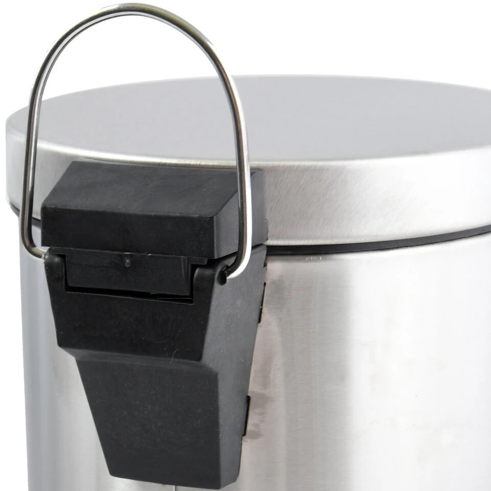 Pedaalemmer voor badkamer en toilet, klein model met inhoud 5 liter, kleur glans zilver. Deze prullenbak is gemaakt van rvs(metaal) en heeft een formaat van ca. L20 x H27 cm. Deze kleine pedaalemmers hebben een uitneembare binnenbak. De deksel heeft dezelfde kleur. Robuust en makkelijk te legen. Afvalemmers, pedaalemmers en prullenbakken.