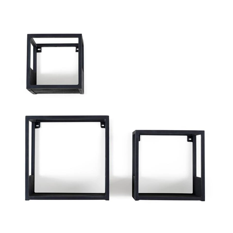Breng een vleugje elegantie en functionaliteit in uw huis met dit prachtige zwarte mango houten wandrek. Dit wandrek bestaat uit drie vierkante wandplanken met een metalen frame en een zwarte mango houten inleg, waardoor het zowel stevig als stijlvol is. Het minimalistische ontwerp zorgt voor een eigentijdse uitstraling die past bij elk type interieur. Gebruik de planken om uw favoriete decoratieve objecten, boeken of planten tentoon te stellen, terwijl u tegelijkertijd extra opslagruimte creëert. Het gebruik van hoogwaardige materialen en de zorgvuldige afwerking garanderen dat dit wandrek lang meegaat en een blijvende indruk zal maken. Kortom, dit zwarte mango houten wandrek is een must-have voor wie op zoek is naar een functioneel en stijlvol meubelstuk. Afmetingen: 30 x 30 x 16 / 25 x 25 x 16 / 20 x 20 x 16 cm