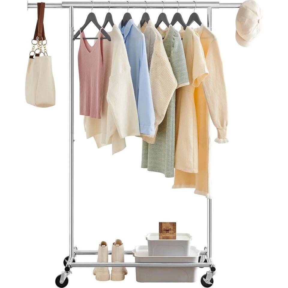 Heavy Duty Verrijdbaar Kledingrek met Uitschuifbare Kledingstang van 92 -> 132 Cm. met Zwenkwielen. Zeer stevig, professioneel (tot 90kg belastbaar!) en stabiel kledingrek met wieltjes en verstelbare breedte. Op de onderste dwarsbalken bevindt zich een praktische opbergplek, bijvoorbeeld voor schoenen. Perfect voor uw bedrijf, winkel, kantoor en voor thuis.
