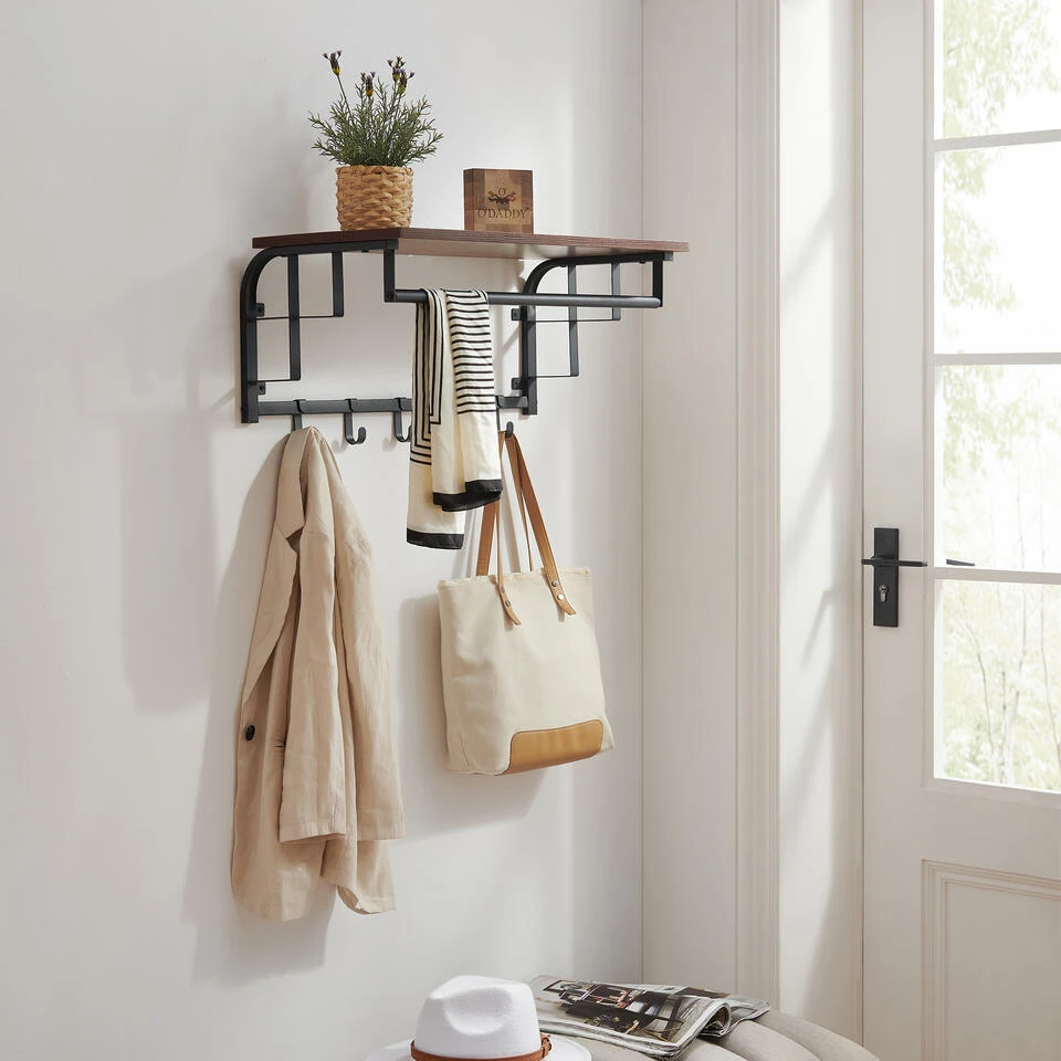 DRIE IN 1 DESIGN: Deze kapstok wordt geleverd met een grote plank (66 x 30 cm), een ophangrail en 5 haken om met een minimale ruimte aan uw verschillende behoeften te voldoen; te gebruiken als displayplank, kapstok of hoedenplank