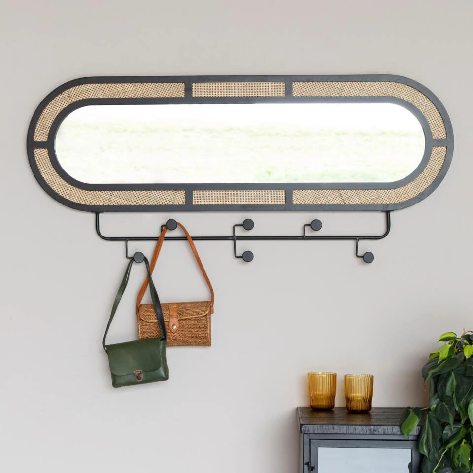 Horten kapstok ovaal komt uit het woonmerk Puur. Ze valt op door haar ovalen vorm en het materiaalgebruik. De rand is gemaakt van rotan op een gepoedercoat zwart ijzeren frame. Dit straalt luxe en rust uit. Daarnaast komt deze kapstok goed tot zijn recht in een interieur met diverse natuurtinten. Dit is een spiegel en kapstok in een. De kapstok heeft zes haken. Perfect geschikt in bijvoorbeeld de hal of op kantoor. Horten is ook verkrijgbaar als spiegel in rond of ovaal. Combineer de diverse varianten voor eenheid binnen het interieur. Ze brengt rust en kalmte in iedere ruimte. Deze variant heeft een afmeting van 120x55x5 cm.