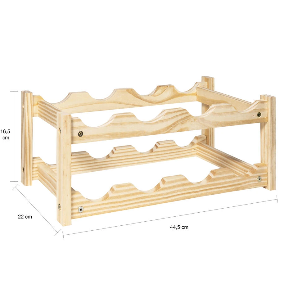 Dit wijnrek liggend is gemaakt en van robuust hout, wat zorgt voor een eigentijdse en neutrale uitstraling. De flessen liggen door het voorgevormde design altijd stevig in deze compacte en fijne wijnkast. Het model heeft een afmeting van 22 x 44,5 x 16,5 cm (lxbxh) en is hierdoor een handige accessoire voor op bijvoorbeeld dressoirs.