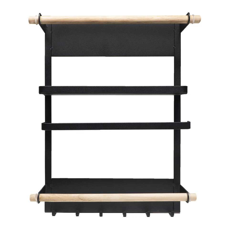 Het keukenrek in het zwart met magneetstrip is 35 cm hoog, 27 cm breed en 7,5 cm diep. Het plateau waar potjes opgezet kunnen worden meet 5,5 x 24 cm. Hij past daardoor op (bijna) elke koelkast,maar is natuurlijk ook te bevestigen aan alle magnetische oppervlakten. Bovenaan het rekje is een houten stang om wat aan te hangen of bijvoorbeeld een bord achter te zetten. Dat bord kan dan ondersteund worden door het metalen plankje eronder. Onder het plankje bevind zich een metalen stang,met een opening aan de zijkant. Vervolgens is er weer een houten stang. Helemaal onderaan zijn ook nog een aantal metalen haakjes te vinden,hier kunnen handdoeken aan opgehangen worden.