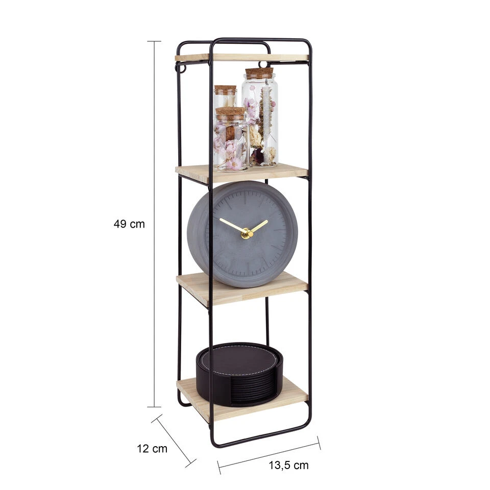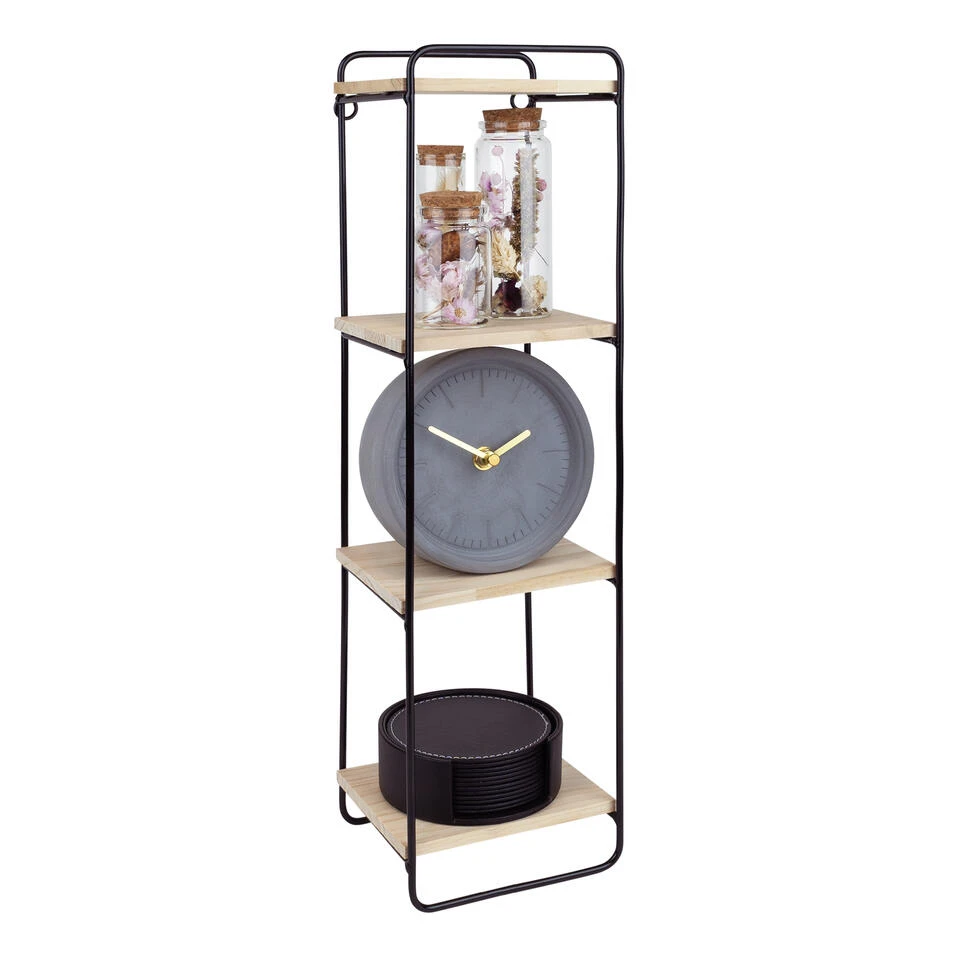 Dit mooi vormgegeven, metalen wandrek bestaat uit een frame met vier houten plankjes. Het frame is eenvoudig aan de muur te bevestigen door gebruik te maken van de bijgeleverde materialen. Het is geschikt voor haast iedere ruimte in huis en een echte eyecatcher in het interieur.